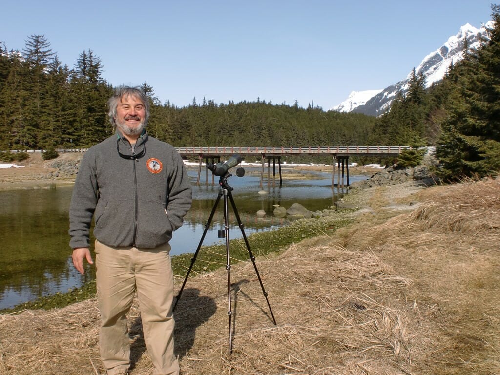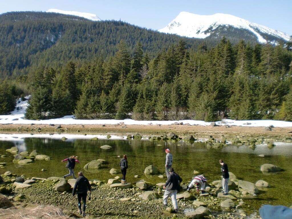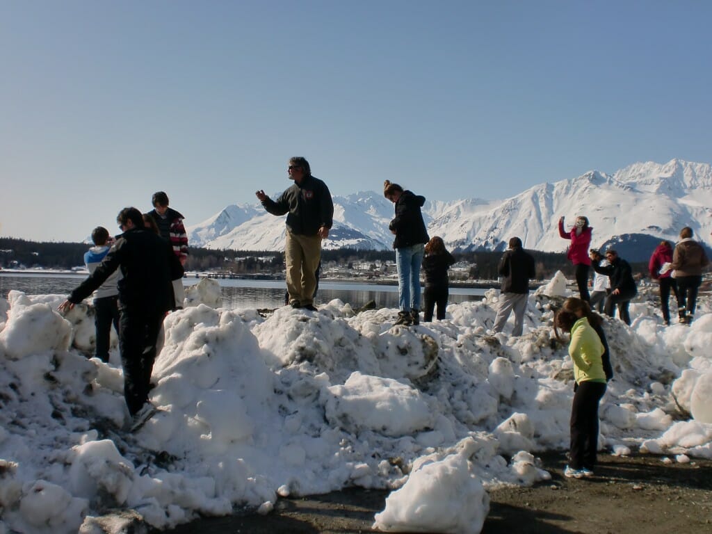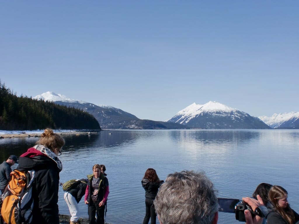 We drove toward our morning destination, the Chilkoot River, with a few scenic stops along the way. Picture Point is the pride and joy of Haines locals. There may be more photos from that view point than any other in Haines. The stop was packed with snow berms from the winter plowing but that didn’t stop Joe Ordonez. He just climbed right on top of the snow berm to tell his fascinating stories of Haines, Alaska.