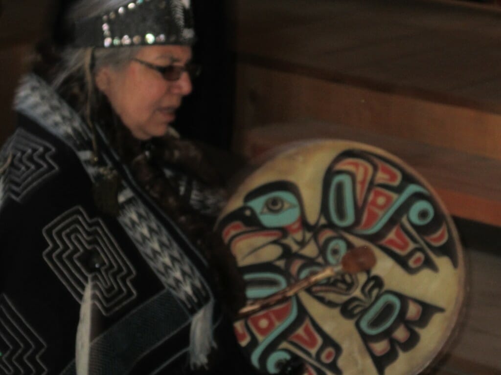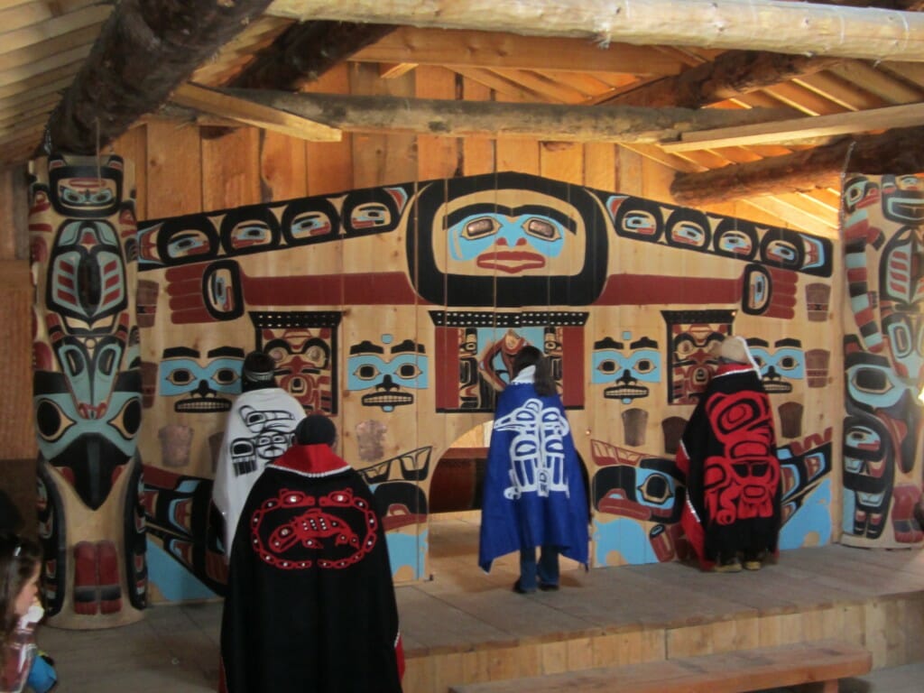Lani Hotch, a local Chilkat blanket weaver/traditional artist, led the songs with her drum beats while they danced with beautiful Chilkat blankets wrapped around their shoulders showing the clan they each belonged to. At one point they invited our group to join in. The French Canadian high schoolers were quick to comply, dancing in the circle like they were born doing it.